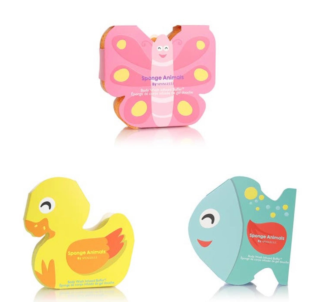 Choose pink butterfly, yellow ducky, or aqua fish infused sponge for a new level of bath time fun!!! These infused sponges are so cute and smell amazing!!