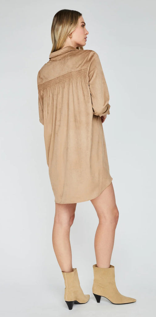 We are in love with this Faux Suede Shirt Dress. The soft, suede fabric exudes sophistication, while the smocking along the back ensures a comfortable and flattering fit. Complete with pockets for added convenience, this dress is both elegant and practical. TTS