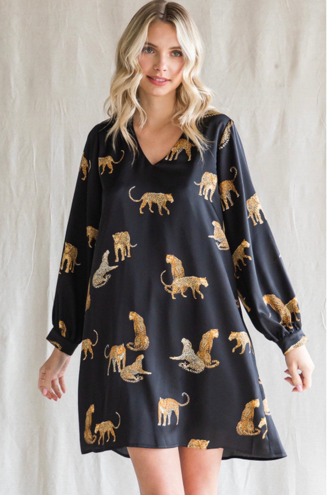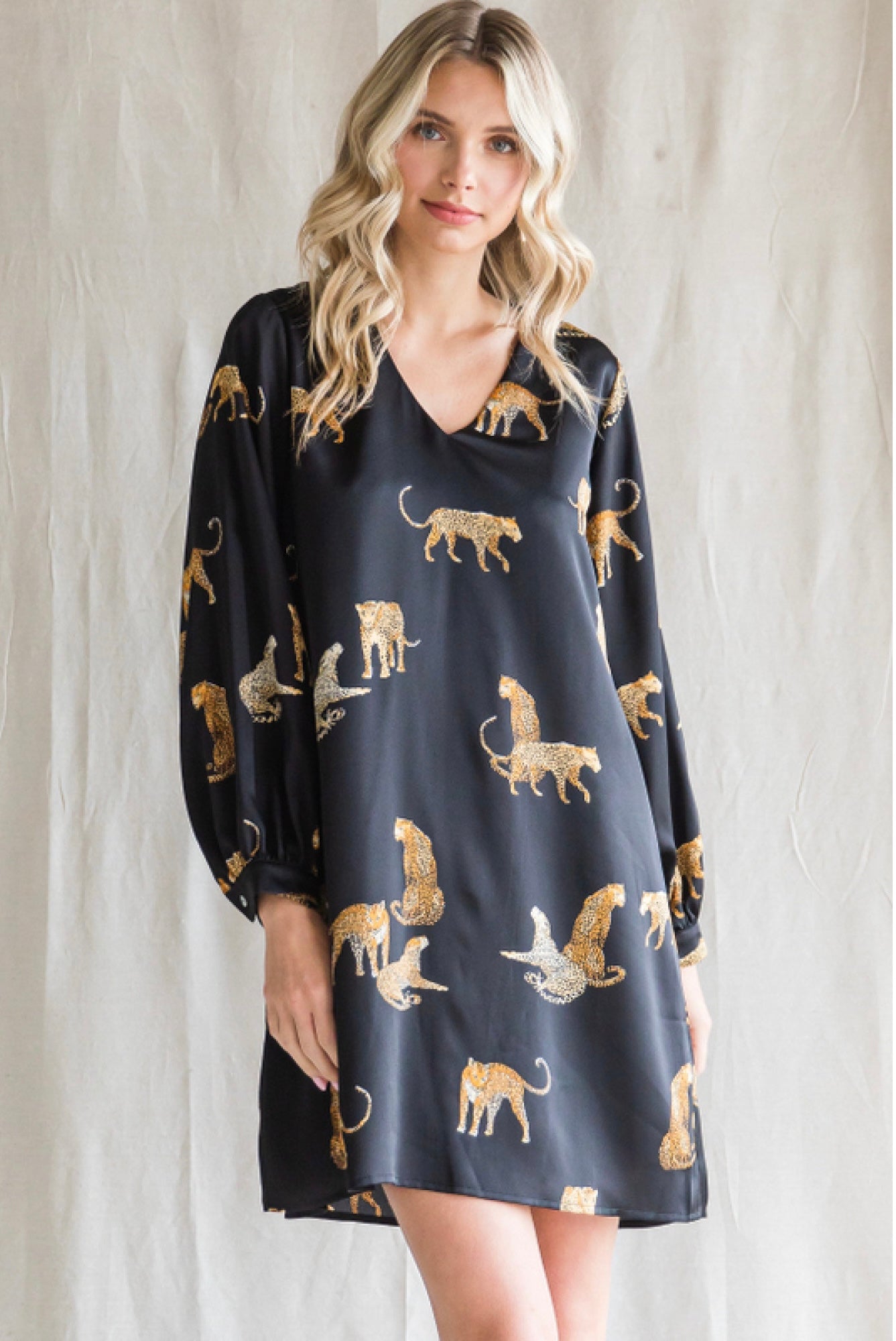 This fierce little number is ready to go!  Perfect for your next special occasion, this Black Cheetah Dress features a satin animal print, a V-neck, long bubble sleeves, and band cuffs.