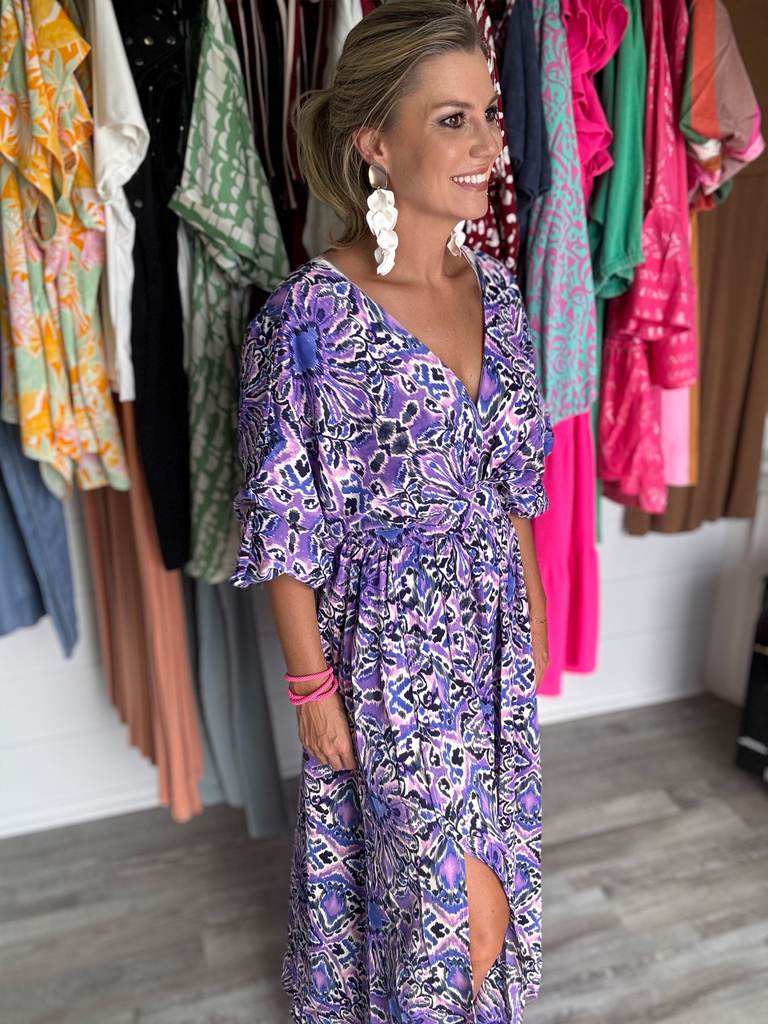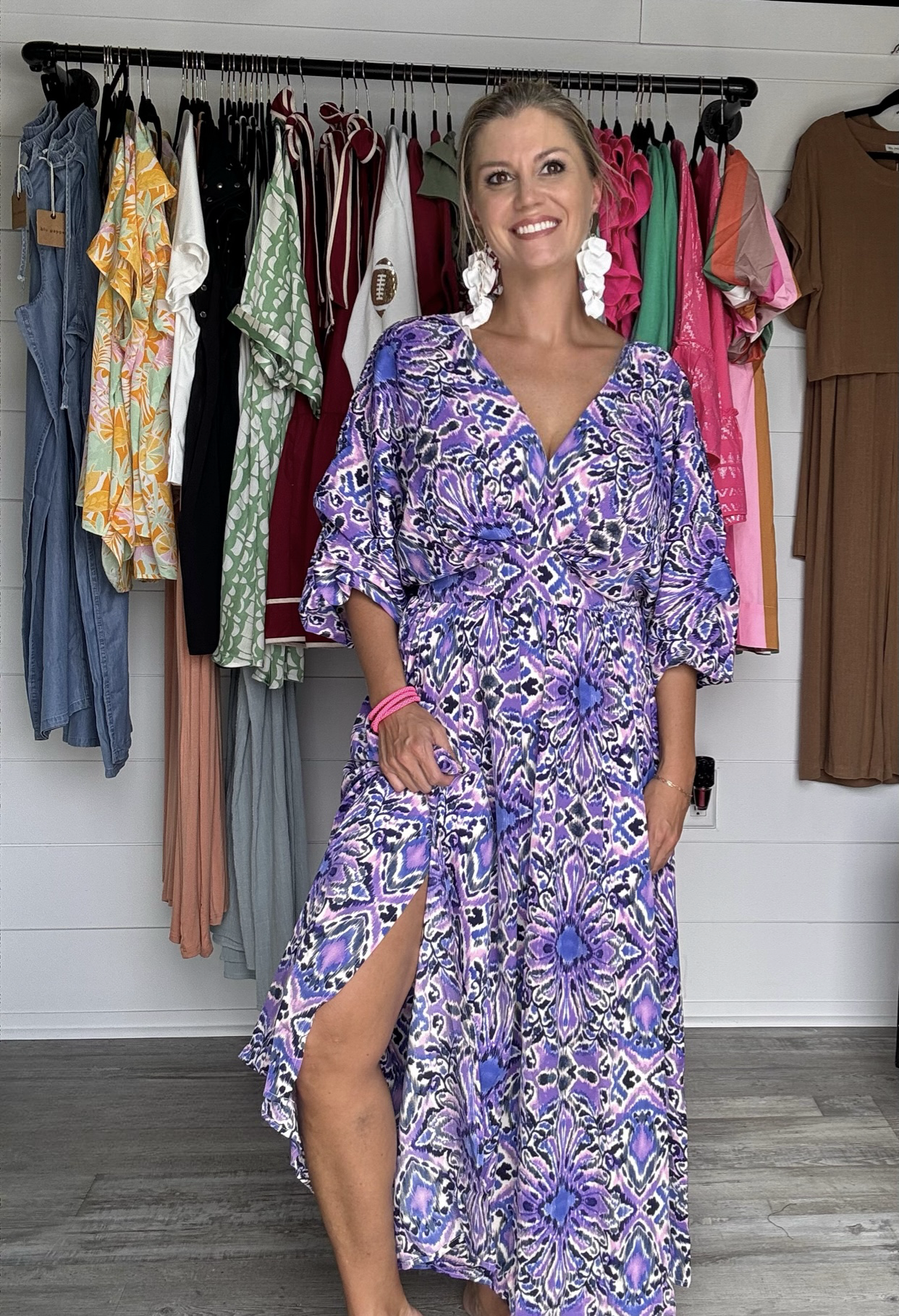 This Purple Haze Maxi boasts 3/4 sleeves and is lined for extra coverage. The perfect addition to your wardrobe for any occasion, this dress is sure to make a statement with its elegant silhouette and versatile design.