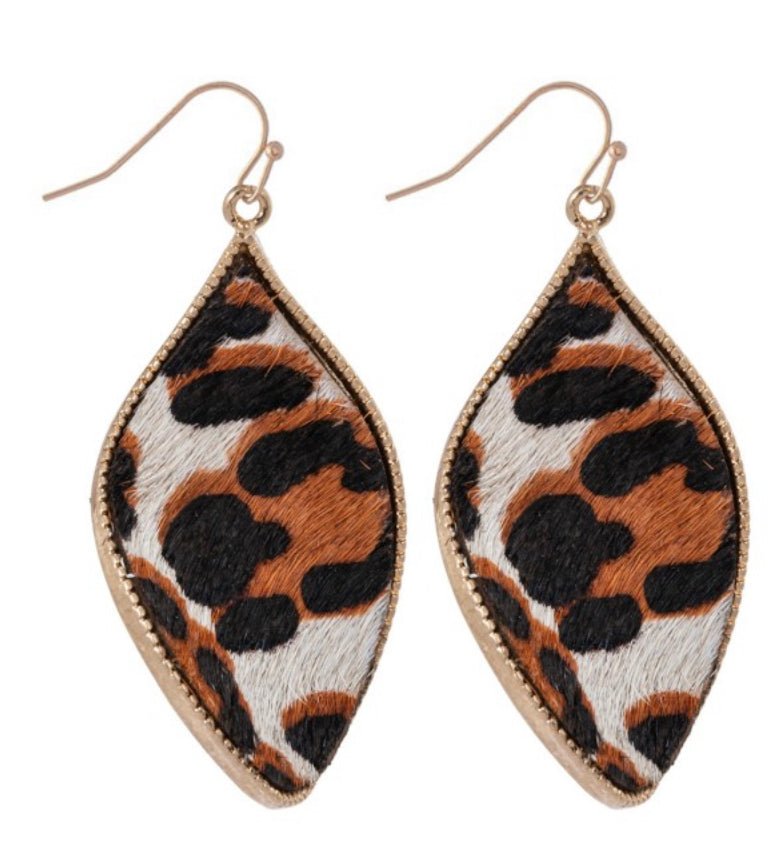 Metal Encased Genuine Leather Leopard Print Curved Teardrop Earrings in Gold