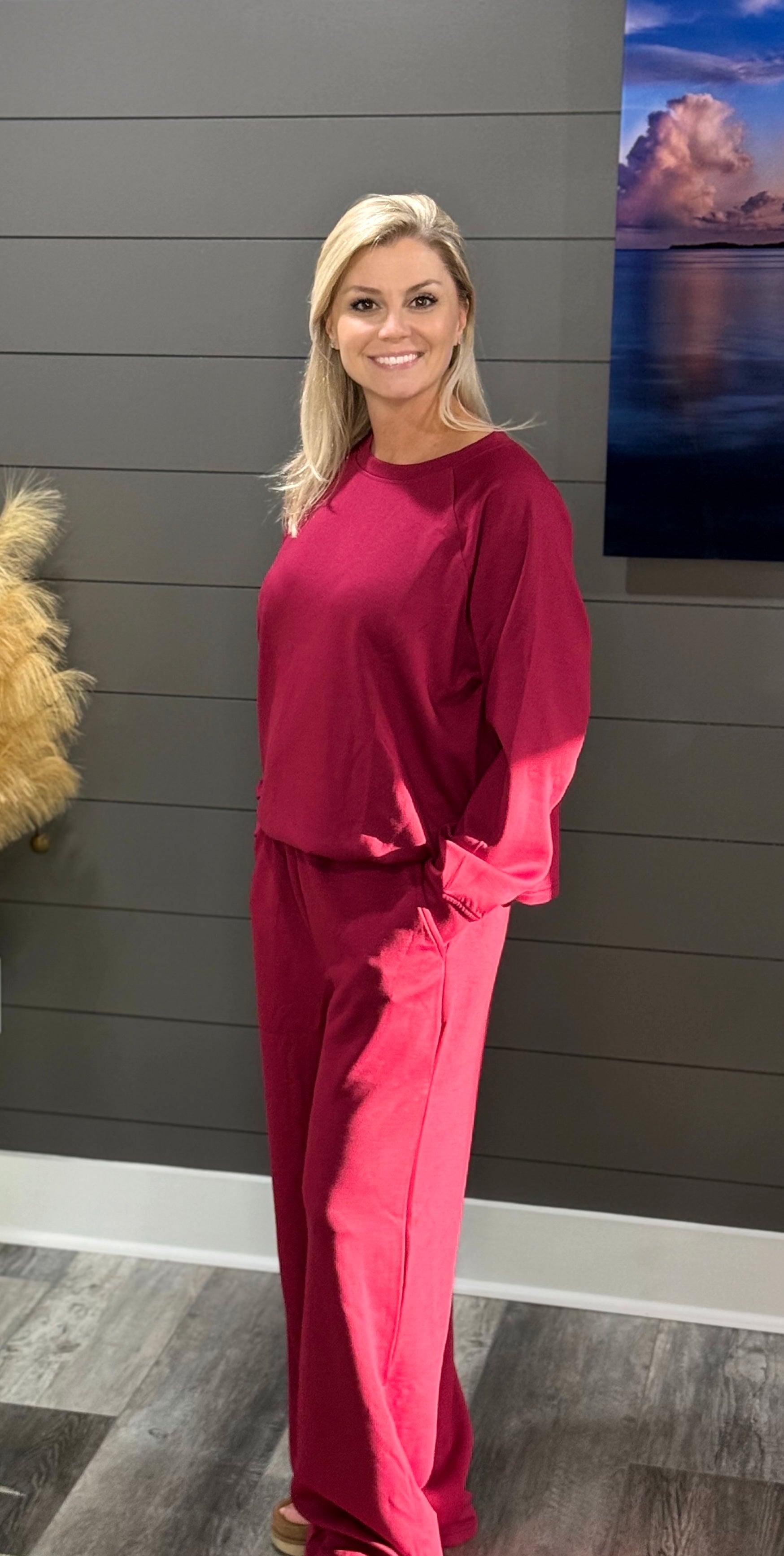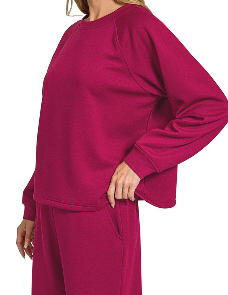 This crewneck scuba set pullover pairs flawlessly with matching pants for a comfy yet put together look. The rich cabernet color is bold and perfect for fall and winter.