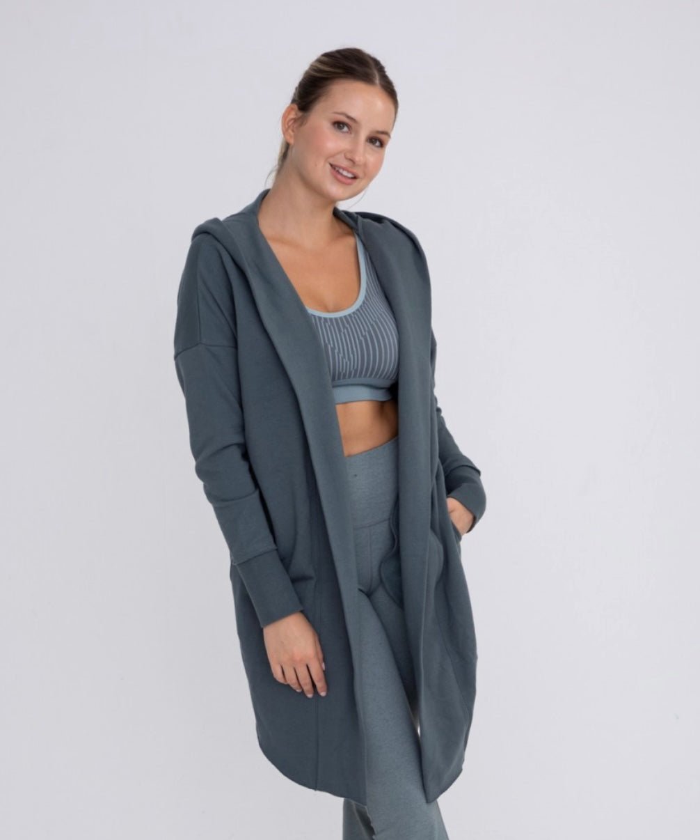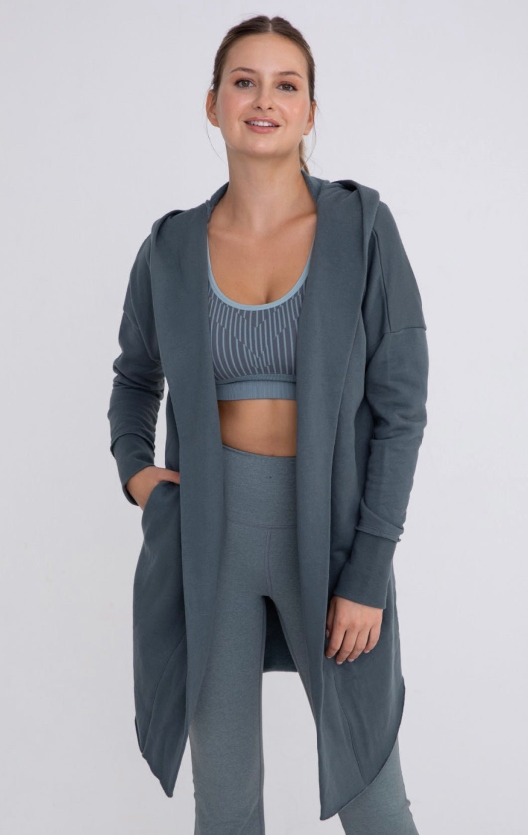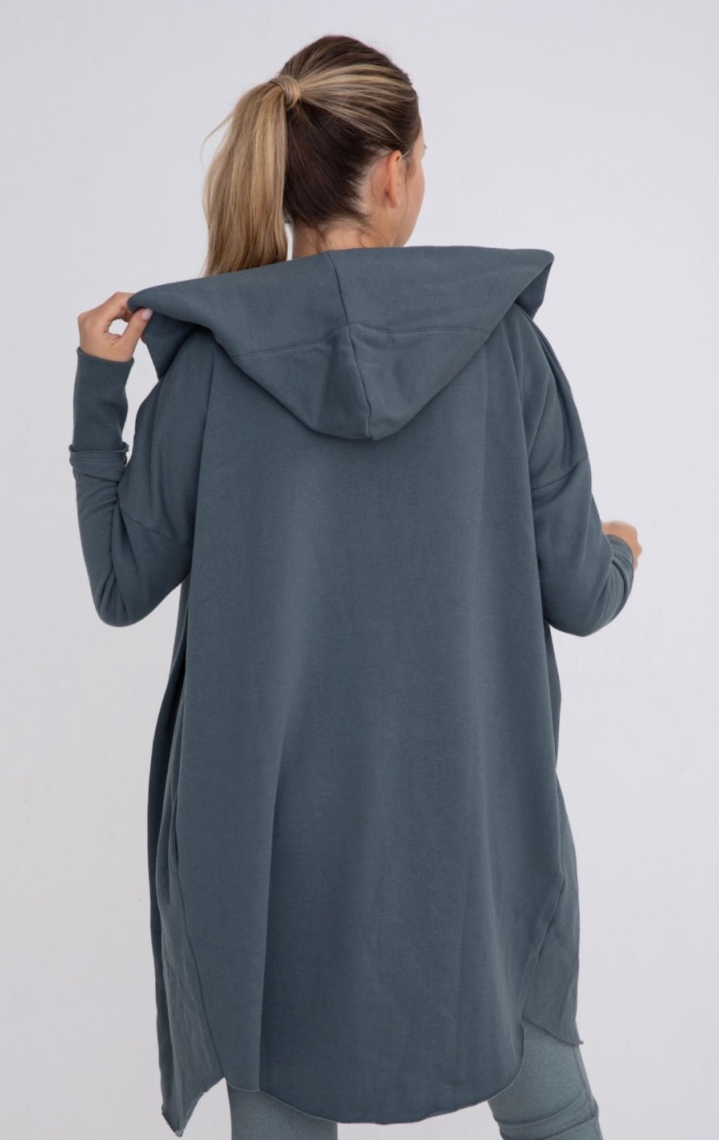 Chic long hoodie cardigan features an open front and wide cuffed sleeves. Fur lining on inside with thumb wholes at sleeves.