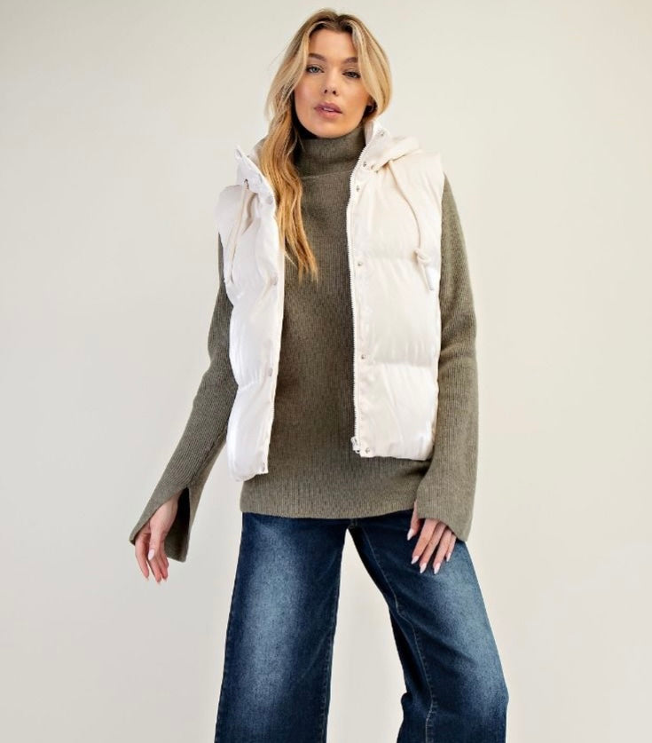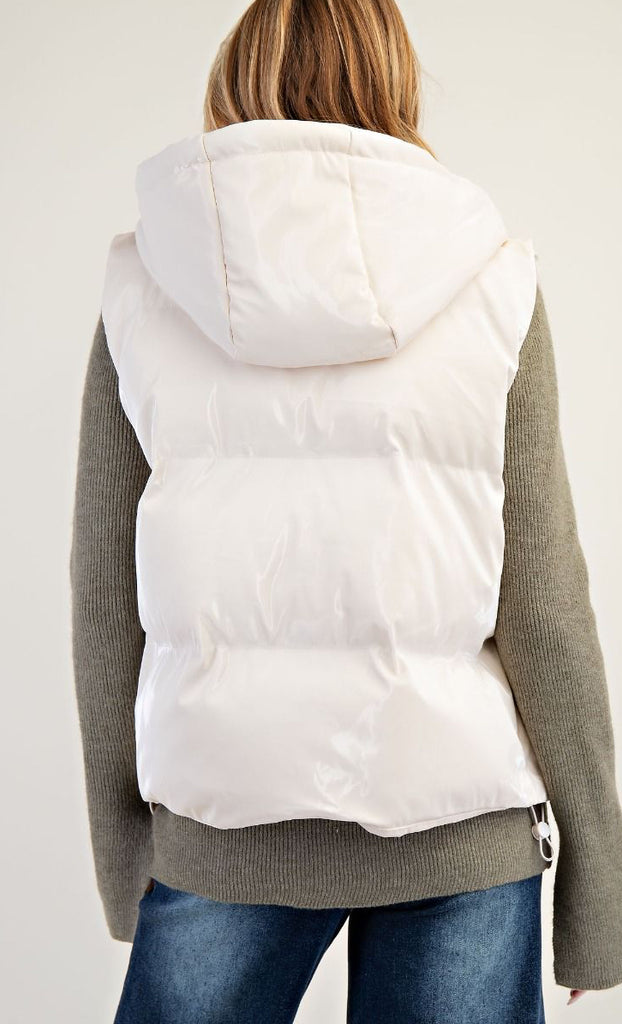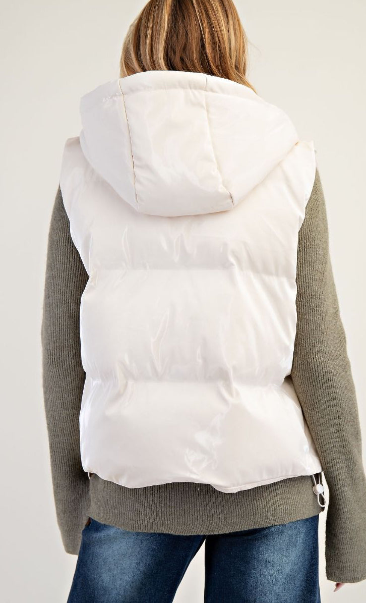 Complete your winter wardrobe with our cream Puffer Vest. Featuring a snap button and zip fly closure, a drawstring hood, and built-in hood, this Winter Essential provides both style and functionality.