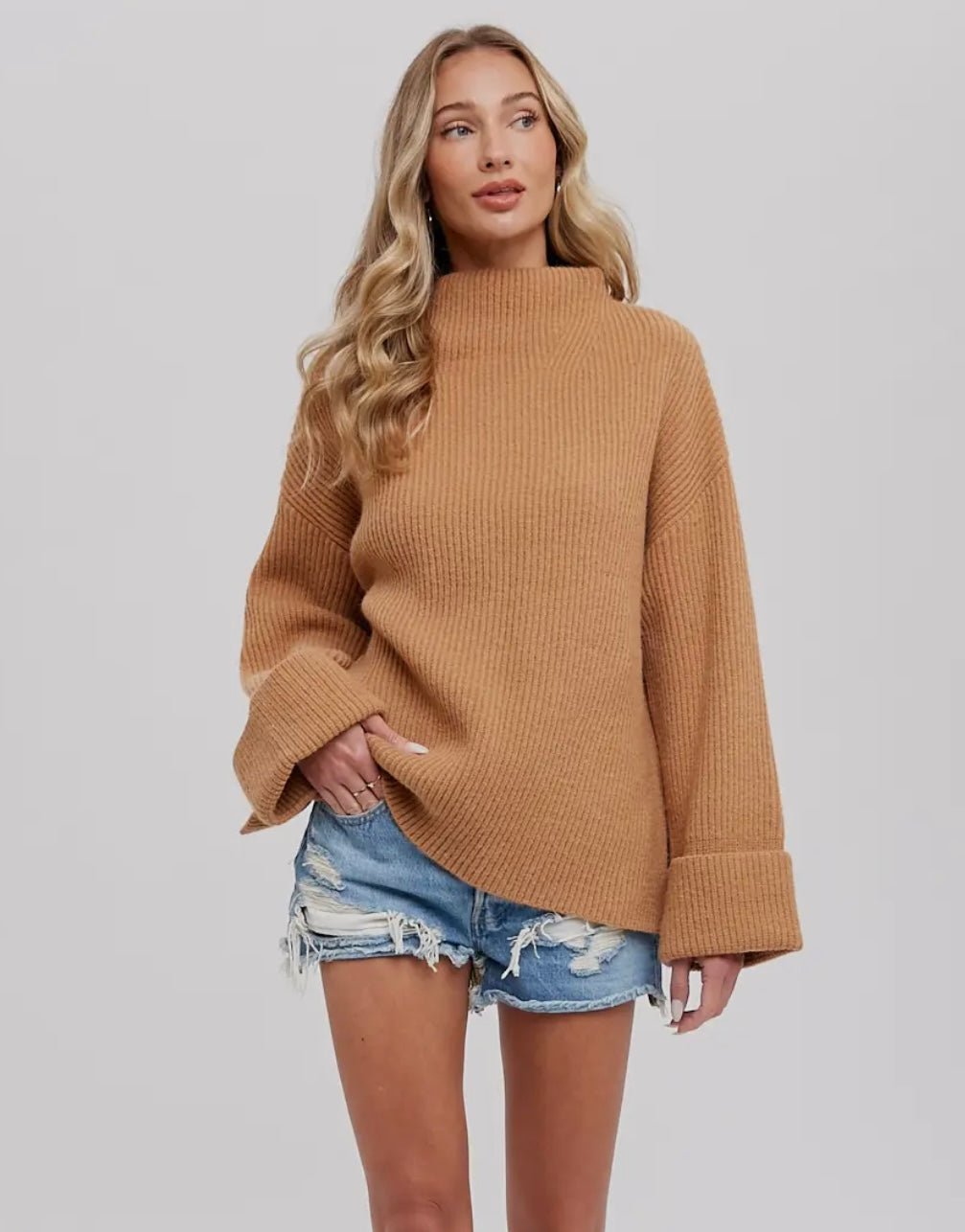 Indulge in the luxury and comfort of our Oversize Tunnel Neck Sweater. The roomy silhouette provides a relaxed and effortless style, while the folded sleeves and side slit hem add a touch of sophistication. Made with a soft rib knit, you'll never want to take off.
