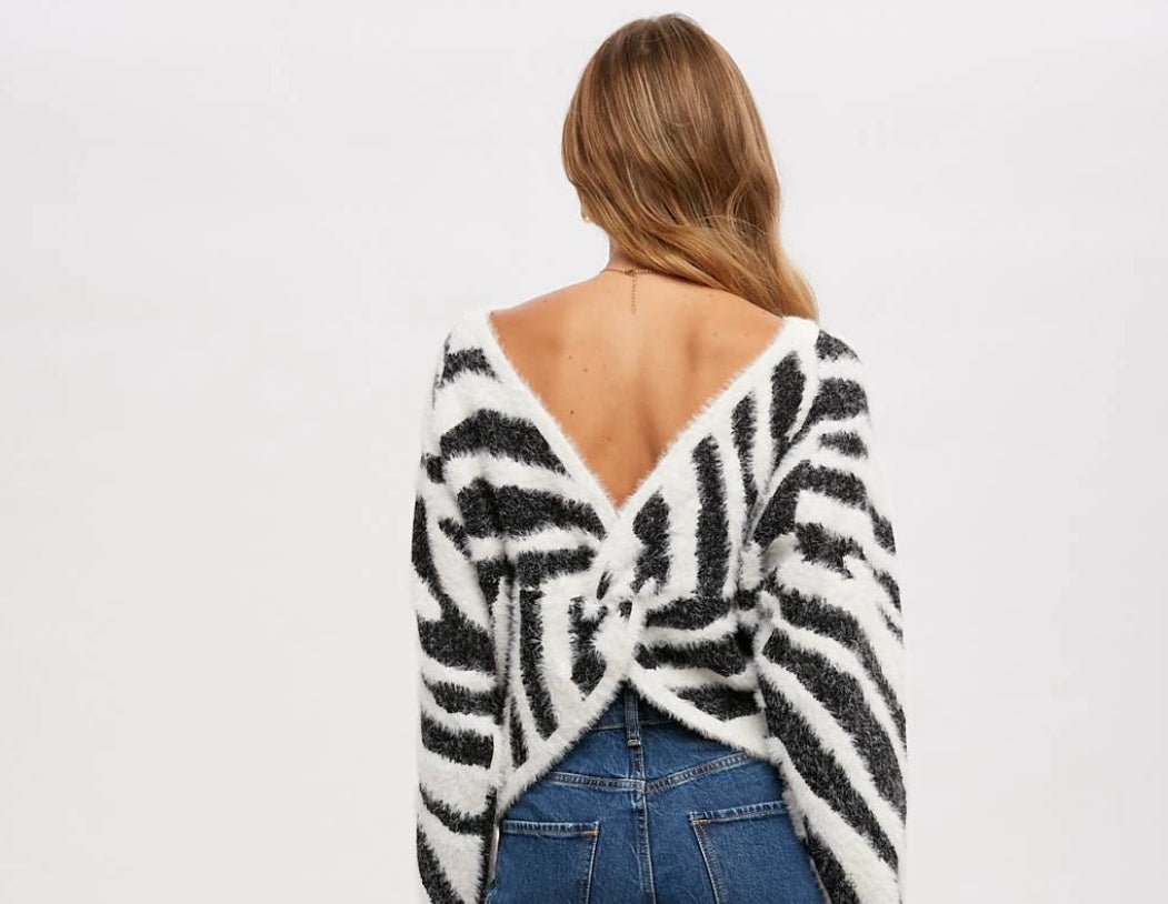 Fuzzy knit sweater featuring an allover zebra pattern, center twist back detail,round neck, long sleeves and a ribbed hem and cuffs. Extra soft luxurious feel with relaxed silhouette.