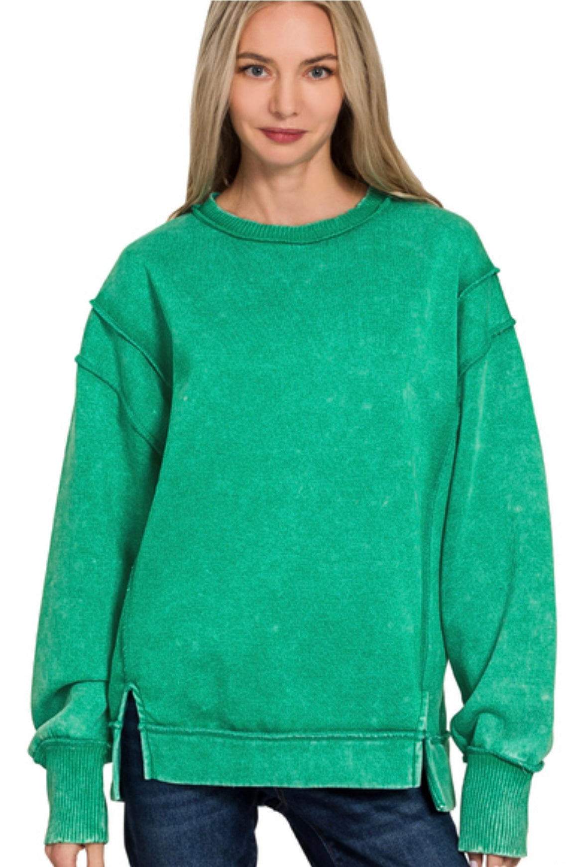 This kelly green sweatshirt features a soft fleece with a perfectly worn-in acid wash look. The Kelly green color pops and the exposed hem gives it an easy laid back edge you’’ll want to live in.
