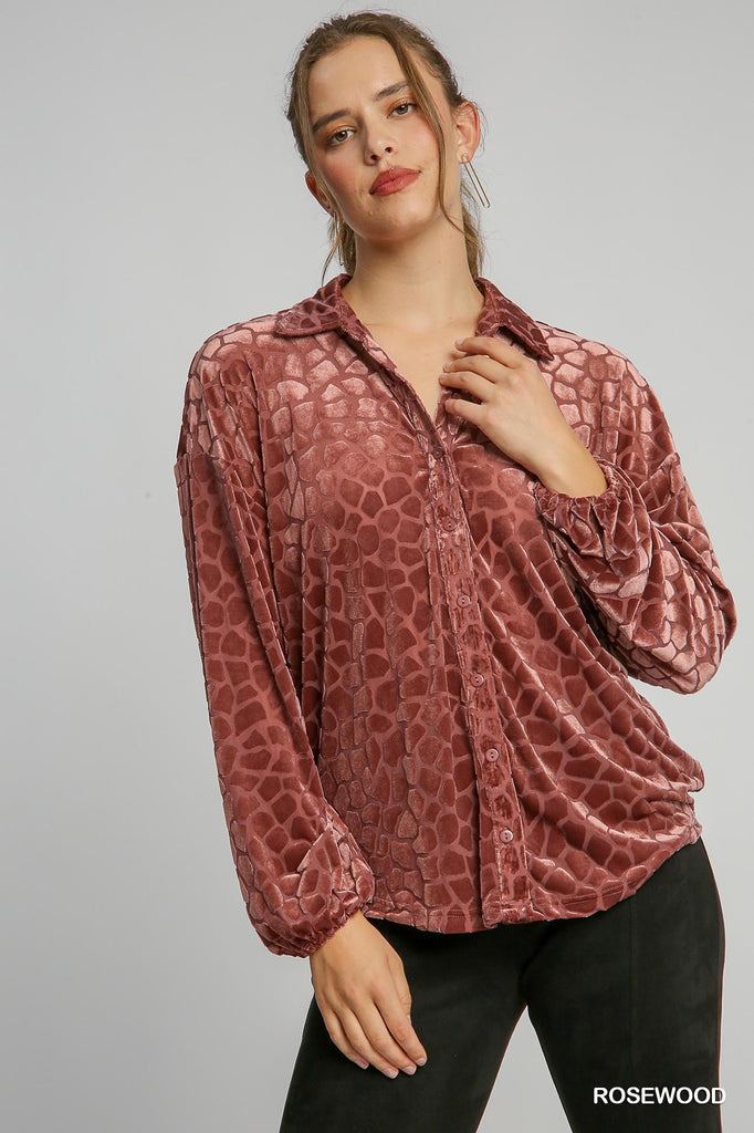 This beautiful burnout velvet top offers a luxurious texture and animal print design. With cuffed long sleeves, it adds a touch of sophistication to any outfit. Plus, its velvet fabrications come in various shades with unique levels of shine. Truly a classy and eye-catching piece.