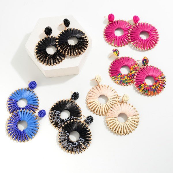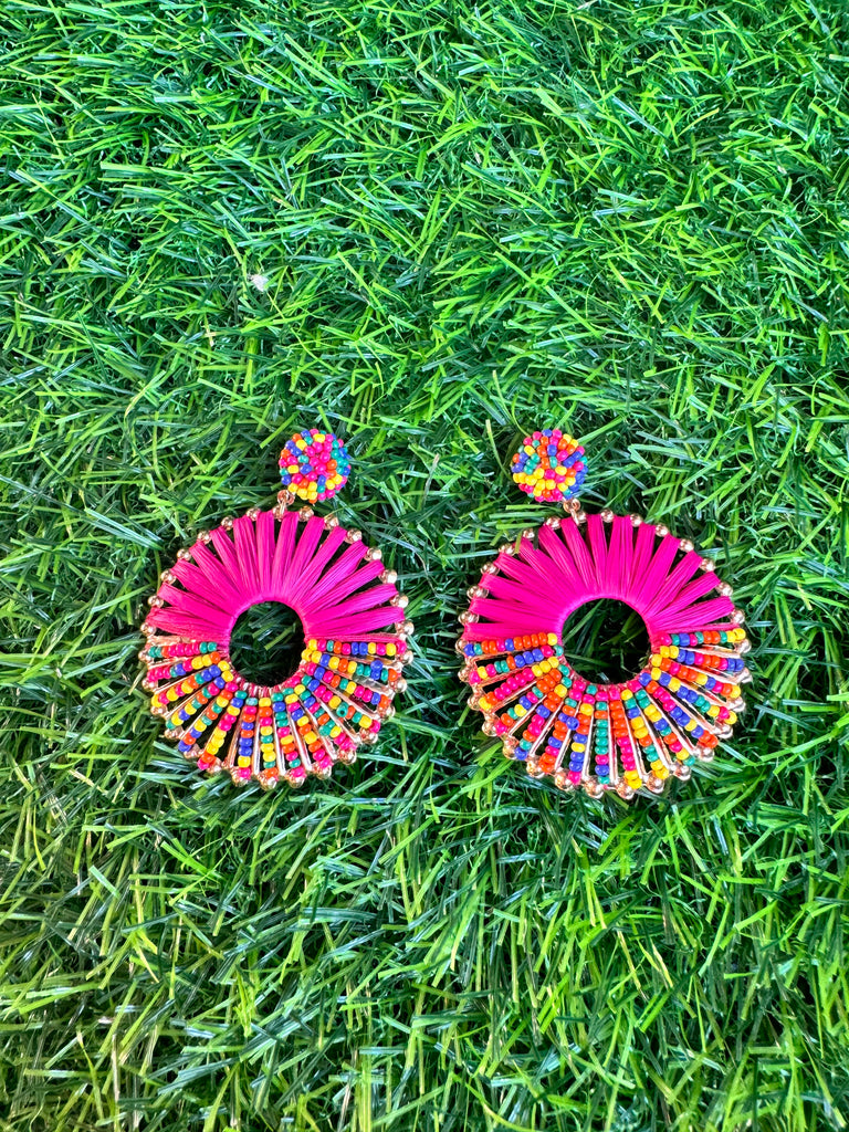 Circular drop earrings with seed bead detail. Wrapped in fuchsia with fun multi-color beading.
