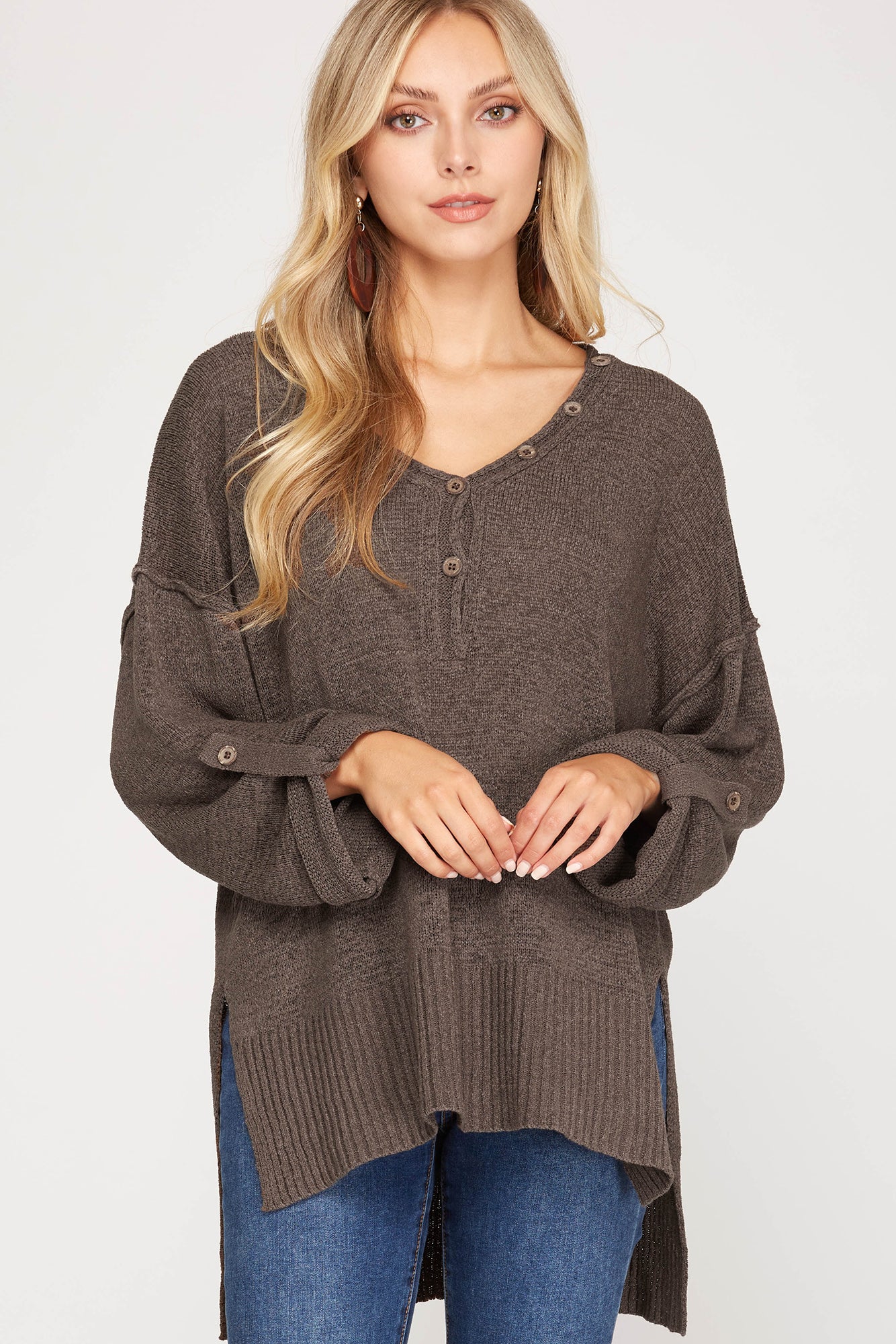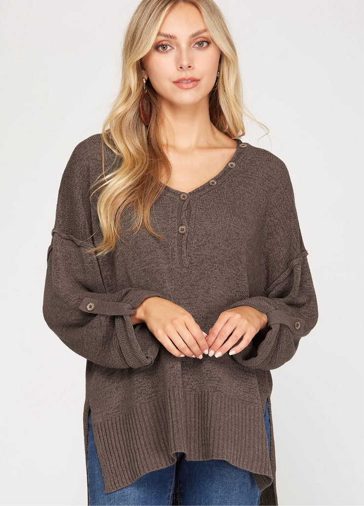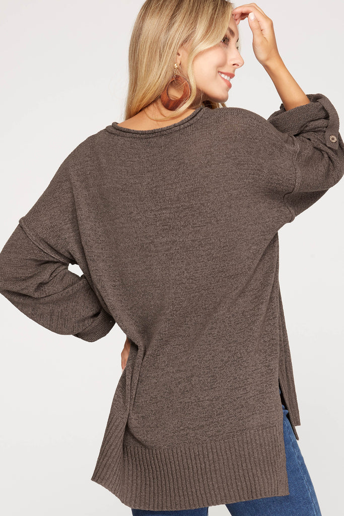 Our Lizzy knit in beautiful chocolate mocha features a roll up sleeve design and a v-neck, creating a stylish and versatile look. The hi-low hem adds a modern touch and the button placket detail adds a unique element.